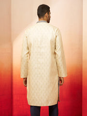 Experience royal elegance with Vastramay's cream silk blend kurta featuring royal blue motif with jacquard ethnic design and thread with zari embroidery on collar and placket. Concealed placket with mandarin collar, premium crepe lining, knee-length with side slits and functional inseam pockets. Perfect for festive occasions, weddings, Diwali, and Navratri celebrations.