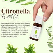 About the Product:Physical Wellbeing : The citronella oil is excellent at relieving spasms of the muscles, respiratory system and nervous system. It also helps to cure menstrual spasms and gives relief from symptoms such as cramps and coughs. Citronella essential oil sedates inflammation, particularly those situations which pertain to the liver, stomach, intestines and other parts of the digestive system. The inflammations caused as side effects of drugs, excessive use of alcohol or narcotics, spicy food or any disease. This oil kills fungus and inhibits fungal growth. This oil is also very useful in countering fungal infections in the ear, nose and throat region.