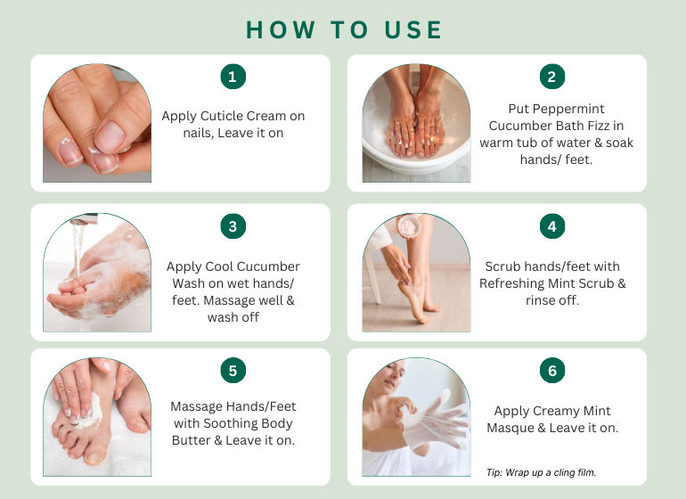 - Apply scrub on hands or feet for 5 - 10 minutes. Wipe with warm towel.