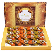 A beautiful box containing Gujiya Sweets in tri color which is a refined flour pastry stuffed with dryfruits cardamom and mawa and then dipped in Sugar Syrup. This mithai has been specially packed using Italian technology for an extended shelflife.