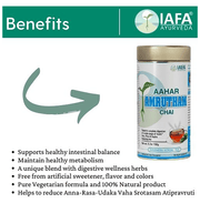 • Iafa Aahar Amrutham Chai is beneficial for maintaining digestive and intestinal health and also improves metabolism. It contains Amalaki which is rich in vitamin C and has detoxification qualities that help to fight free radicals and also provide glowing skin. It also boosts general health. Parushaka helps in the relief of abdominal colic caused by hyperacidity.