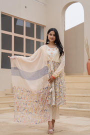 This Ivory 3-piece dress set combining embroidered detail, floral prints, and rich color. The outer flared jacket-style dress features fine thread embroidery on the yoke and sleeves, tied at the waist with a drawstring. Underneath lies a solid inner layer providing modesty and contrast. A printed dupatta in matching tones completes the look. Perfect for festive events, receptions, or cultural functions, this set is a contemporary take on ethnic charm.Legal Disclaimer :Product color may slightly vary due to photographic lighting sources or your monitor settings.