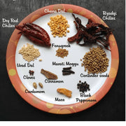 Ingredients : Corriander , Jeera , Clove , Cardamom , I Pepper , Cinnammon , Chakkara Moggu , Moggu ,Poppy Seeds , I ChannaDal , Moong Dal , Urad Dal , Dry Red Chillies , Ingu