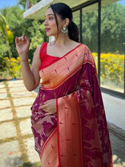 Luxurious comfort and timeless elegance come together in the Paithani Silk Pichwai Woven Saree. Crafted from premium soft Paithani silk with rich pichwai weaves, this saree comes with a rich paithani meenakari pallu and a contrast plain blouse. Enjoy all-day comfort and exquisite style.