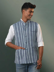 Indigo cotton striped pattern kantha stich Nehru jacket mandarin collar, button placket, sleeveless and comes with pocket square.