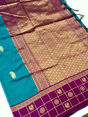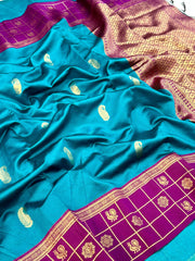 This Banarasi Katan Silk Saree, crafted in a stunning peacock-feather–inspired colour body that radiates luxury in every fold. The saree features an exquisite Gadwal-style contrast border, intricately woven to highlight the perfect blend of tradition and artistry. Completing the masterpiece is a rich gold zari pallu, shimmering with timeless Banarasi finesse.A perfect choice for weddings, festivities, and grand celebrations.