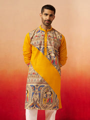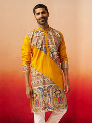 Celebrate with style in Vastramay's yellow cotton kurta featuring digital print figures on collar and front placket with mandarin collar and button closure. Knee-length with side slits and practical inseam pockets. Perfect for Durga Puja, Navratri, and festive celebrations requiring contemporary digital artistry with traditional appeal.