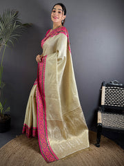 Drape yourself in the elegance of tradition with this exquisite Pochampally Ikkat Saree, featuring a stunning ikat weaving border that celebrates the rich heritage of Indian craftsmanship. The body shimmers with fine gold zari weaving, lending it a graceful luster perfect for festive occasions and celebrations. Completing the look is a richly designed pallu that adds opulence to every drape, paired seamlessly with a braced blouse that enhances its timeless appeal.