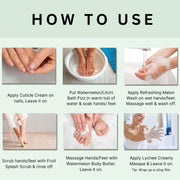 - Apply scrub on hands or feet for 5 - 10 minutes. Wipe with warm towel.