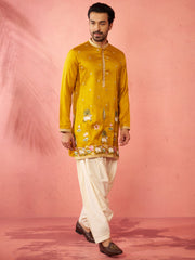 Experience traditional elegance with Vastramay's mustard silk blend kurta featuring authentic thread embroidery and paired with comfortable cream cotton blend patiala. The mid-length kurta with intricate embroidery on front, collar, placket and sleeves offers perfect festive styling for Diwali and special occasions.