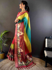 This Elegant Silk Blend Bandhani Print Saree is a stunning blend of vibrant hues and intricate patterns, radiating elegance and charm. The fabric of Elegant Silk Blend Bandhani Print Saree is adorned with a unique tapestry of bandhani prints, featuring a symphony of colors like radiant yellow, bold red, and deep green. The border boasts intricate floral and cultural motifs that add a traditional yet contemporary flair to Elegant Silk Blend Bandhani Print Saree.
