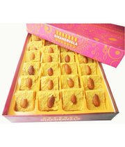 A delicious Indian flaky and layered sweet made from wheat flour, besan, turmeric in pure desi ghee. The sweet is enriched with melon seeds, pistachios, almonds in plenty. The crunch in each bite makes it a perfect choice for any festivity.