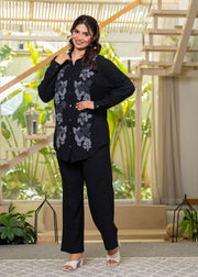 Sophisticated black viscose-linen co-ord set featuring an embroidered shirt with shirt collar, full sleeves, front slit, and button closure. Paired with ankle-length slip-on pants with parsley waistband. Loose fit, ideal for casual occasions.Legal Disclaimer :Product color may slightly vary due to photographic lighting sources or your monitor settings.