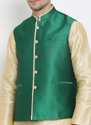 Green solid Nehru jacket, has a mandarin collar, a full button placket, sleeveless, three welt pockets