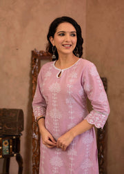 Juniper Lavender Embroidered Cotton Kurta With Palazzo & Cotton Sleeves