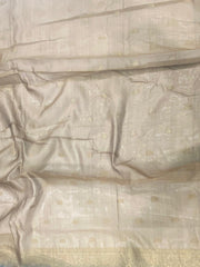 This exquisite saree is crafted from soft silk, offering a luxurious feel and a graceful drape. The saree is beautifully embellished with a traditional gold zari weaving border, which showcases intricate geometric patterns that reflect timeless artistry. The pallu is adorned with a captivating Kalamkari print, makes this saree an elegant choice for any special occasion.