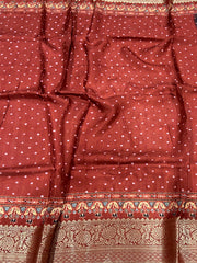 Pure Viscose Dola Silk Saree adorned with exquisite Bandhej Print. Crafted with the utmost care and attention to detail,The luxurious drape of pure viscose dola silk lends a graceful flow to the saree, The fabric is soft to the touch, offering comfort throughout the day or evening.Whether worn for a festive celebration, a formal event, or a special occasion, this saree exudes charm and allure.