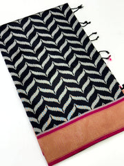 This Banarasi Soft Silk Saree, designed in a stunning celebrity-style drape that exudes luxury from every fold. The body features a graceful sheen of premium soft silk, perfectly paired with a striking dual Ikkat design that adds a bold artistic edge. The highlight of the saree is its contrast Pichwai-inspired rich pallu, adorned with traditional motifs that celebrate India’s divine heritage and artistic glory.perfect for weddings, festive events, and high-fashion celebrations.