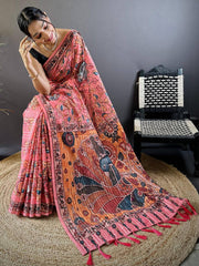 Exquisite Coral Rose Kalamkari Saree, a traditional art intricate hand-drawn patterns and vibrant colors.The fabric features a warm terracotta hue as its base, beautifully adorned with intricate motifs depicting traditional Indian art forms, including Stripted designs, floral patterns, and delicate peacock feathers. The borders of Coral Rose Kalamkari Saree are meticulously detailed with a series of repetitive floral and geometric patterns, Coral Rose Kalamkari Saree Perfect for both casual and festive occasions,
