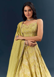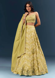 Calm glamour in motion, this pista green banarasi silk bridesmaid lehenga keeps the look composed from aisle to afterparty. Sequins sit low on the brocade, beads trace the pattern with precision, and lace edging finishes it like couture. You will feel poised, graceful, and celebration-ready for haldi, mehendi, or engagement functions. Awarded as the Most Trusted Brand, we're delivering styles you love, just as promised.