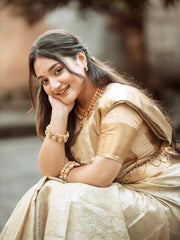 Experience timeless grandeur with this exquisite Gold Zari Kanjivaram Tissue Saree, intricately woven with shimmering gold kasab zari work across the body and borders. The saree features a luxurious Banarasi silk base, exuding a radiant sheen that complements its opulent craftsmanship. A richly adorned pallu adds a regal finish, making it a perfect choice for weddings, festive celebrations, and grand occasions.