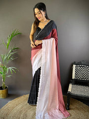 This elegant fabric of Celestial Glow Zarocan Chiffon Saree features a harmonious blend of vibrant and rich hues,The material of Celestial Glow Zarocan Chiffon Saree features a stunning digital printed design with a stippled effect, showcasing a vibrant array of black and white-colored hues that transition beautifully across the fabric. Adding to its luxurious appeal, the fabric is adorned with intricate Zarocan cut work along the borders, Delicate Swaroki work further enhances the fabric with sparkling accents, making Celestial Glow Zarocan Chiffon Saree an ideal choice for style at any special occasion.