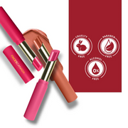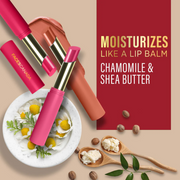 Meet the lipstick of your dreams! 3-in-1 long stay matte lipstick + primer + lip balm that will give you smooth, flawless lips while keeping them feeling comfortable all day. 8hrs fade-proof and no touch ups needed - guaranteed! Time to switch your everyday bullet lipstick for this revolutionary slim stick that offers the ultimate color & finish of a long wear matte lipstick along with the comfort of a daily-wear bullet lipstick in the most lightweight form you can ever imagine! The plush texture of the lipstick with its velvety-smooth application gives you a luxurious look instantly. The power of a long-lasting matte lipstick with caring ingredients like chamomile & shea butter moisturizes your lips throughout the day. A pigment-packed lipstick that feels super light-weight, you'll forget you have lipstick on. Get ready for this super-power lipstick that comes in a range of 10 warm, bright, dashing colors - A color for every skin tone, we promise!