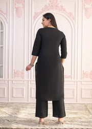 A Black Cotton Slub Kurta With Intricate Thread Work And Floral Design, Paired With A Solid Palazzo Features A V Neckline, Three-Quarter Sleeves, And A Straight Scalloped Shape For A Stylish And Casual Look Perfect For Everyday WearLegal Disclaimer :Product color may slightly vary due to photographic lighting sources or your monitor settings.