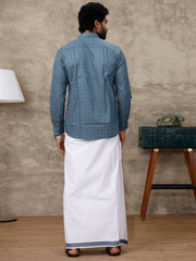 Men Dark Blue With Grey Matching Border Dhoti with Printed Shirt Set Fusion PS4