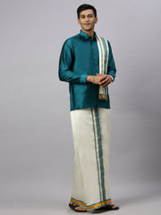 Men Full Sleeves Ramar Green Shirt with Matching Border Cream Dhoti & Towel Set