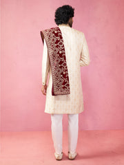 Royal wedding ensemble with beige silk blend sherwani, cream satin pyjama, and luxurious maroon velvet dupatta. Features intricate embroidery work perfect for grand celebrations.
