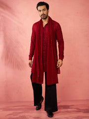Experience luxury with Vastramay's complete 3-piece maroon kurta set featuring rich georgette kurta with intricate honeycomb embroidery, black fine satin palazzo pant, and contrasting bottle green georgette dupatta. The kurta showcases traditional mandarin collar, concealed button placket, and elegant cuffed sleeves with functional side slits. This premium set is ideal for grand Navratri celebrations, Diwali festivities, weddings, and sophisticated traditional gatherings.