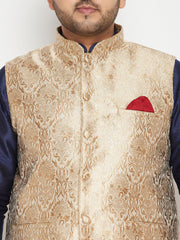 Navy blue solid kurta with solid dhoti pant and golden Nehru jacket