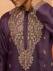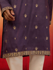 Men's Purple Silk Blend Resham Embroidered Kurta with Cream Pyjama