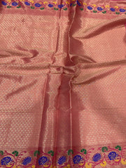 This Radiant Floral Banarasi Kora Silk Saree exudes elegance with its intricate detailing and vibrant colors. The base is a soft cream color with a fine, checkered pattern that lends a subtle sheen and texture. The pallu of the Radiant Floral Banarasi Kota Silk Saree extends this floral motif, creating a harmonious balance between the base and border. The Radiant Floral Banarasi Kota Silk Saree is paired beautifully with a matching pink blouse, enhancing the overall graceful and traditional look.