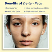 About the Product:Our powerful De-Tan Pack works wonders to detoxify & clarify your skin. Azelaic Acid helps to even out your skin tone, while Glycolic Acid gently exfoliates, removing dead cells & revealinga smoother, brighter complexion. Tranexamic Acid targets dark spots, helping to reduce pigmentation & further enhance your glow. Niacinamide brightens and revitalizes for softer skin. The soothing blend of Lavender, Neroli, and Petitgrain oils detoxifies and refreshes, leaving your skin visibly clearer, detoxed, and beautifully detanned!