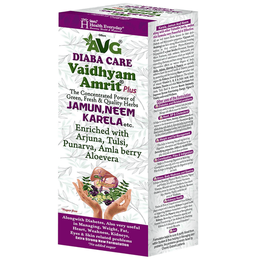 AVG Diaba Care Vaidhyam Amrit PlusIngredients: Jamun Neem Karela Arjuna Amla Aloe vera Vijaysar Punarva How to use: Take 20ml twice a day to be con...
