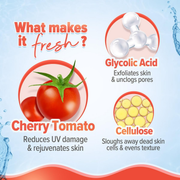 • Formulated with Cherry Tomato extract, Glycolic Acid, and Hyaluronic Acid.