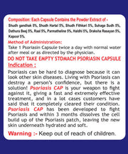 • Take 1 Psoriasin capsule twice a day with normal water after meal. Or as prescribed by the expert.