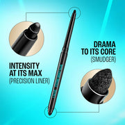 - Intense drama kajal with 2× darker pigment and built‑in smudger/ sharpener. The one‑stroke formula glides on smoothly to give precise lines that last up to 24 hours. Waterproof and smudge‑proof for all‑day wear; safe for sensitive eyes and can be used as kajal or eyeliner.