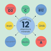 Product Details: Formulated with Vitamin C, Turmeric, Vitamin B12, and Zinc to support a strong immune system. Usage: Give one gummy daily to children aged 7-12 years. For optimal benefits, continue use for a three-month period.