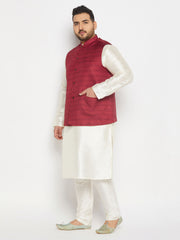 Maroon Matka Silk Nehru Jacket With Cream Silk Blend Kurta and Pant Style Pant style Pyjama Set.