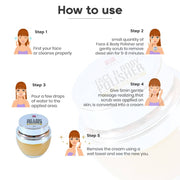 • Take a small quantity of Face & Body polisher and gently scrub to remove dead skin for 5-8 minutes.