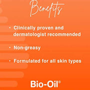 Bio-Oil Skincare Packed with powerful natural oils. Improves Appearance of Acne scars and stretch marks from pregnancy, surgery, injury, acne, C-section, aging, and more. This non-greasy body oil hydrates skin and helps retain moisture to repair scars without clogging your pores and Works naturally to improve the appearance of uneven skin tones, for light and dark skin tones. Bio-oil Helps soften skin and repairs damage for all types, tones, textures, and areas of your skin.