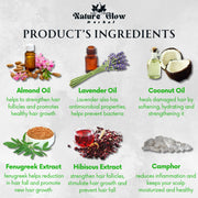 Almond Oil, Coconut Oil, Bhringraj Oil, Jojoba Oil, L A V E N D E R O I L , O N I O N Blackseed Oil, Tulsi Extract, Ginger Extract, Neem Extract, Fenugreek Extract, Hibiscus Extract, Camphor