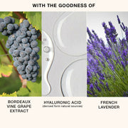 • This body lotion is light weight and extremely moisturising. With the goodness of Bordeaux Vine Grape Extract, French Lavender, Hyaluronic acid, Algae and Calendula, it provides ultimate boost of nourishment and hydration to the skin as well as, promotes good skin health. It protects the skin barrier and keeps your skin moisturised for long hours.