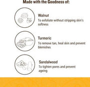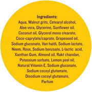 Aqua, Juglans regia (walnut) shell grits, Cetearyl alcohol, Aloe barbadensis (aloe vera) leaf juice, Glycerine, Helianthus annuus (sunflower) oil, Cocos nucifera (coconut) oil, Glycerol mono stearate, Coco-caprylate/caprate, Vitis vinifera (grapeseed oil), Sodium gluconate, Curcuma aromatica (van haldi) extract, Sodium lactate, Azadirachta indica (neem) infusion, Rosa centifolia (rose) petal infusion, Sodium benzoate, L-lactic acid, Xanthan Gum, Prunus amygdalus (almond) dulcis oil, Potassium sorbate, Citrus limonum (lemon peel) oil, Tocopherol, Sodium gluconate, Sodium cocoyl glutamate, Disodium cocoyl glutamate, Parfum, Geraniol, Limonene, Linalool, Benzyl alocohol, Benzyl benzoate, Citral, Citronellol, Coumarin, Eugenol, Farnesol.