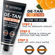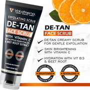 • Volamena De-Tan Face Scrub gently exfoliates dead skin, moisturizes the upper layer of your skin and regenerates cells for a fresh look and youthful radiance. Finely ground walnut shell and glycolic acid gently remove dead cells to instantly reveal the inner glow of your skin, reviving it from the daily wear and tear due to heat, dust and pollution. Vitamin C brightens skin and ensures a healthier complexion while protecting skin from tanning, making it smooth and refreshed. Beetroot and aloe vera extract are rich in antioxidants, that protect the skin cells from free radical damage and lighten the skin tone to improve the skin complexion. Camphor and eucalyptus oil cleanses skin while providing instant brightening, cooling and lightening benefits. This product combines the benefits of shea butter, jojoba oil which deeply moisturize the skin, and vitamin B3 improves skin hydration level of the skin. After every scrub session, your skin feels tighter, brighter, smoother and younger.