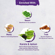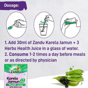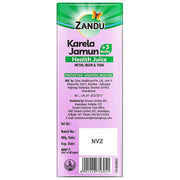 Each 5 ml is prepared from: Karavallaka (Karela) Momordica charantia Linn. Fr. Juice 1.600 mg, Amalaki Emblica officinalis Gaertn Fr. Pulp 0.600 mg, Nimbu Citrus limon (Linn.) Burm.f. Fr. Juice 0.05 mg, Jambu Syzygium cuminii Skeels Sd. & Fr. Pulp 0.758 mg, Seva (Apple) Pyrus malus Linn. Fr. Juice Concentrate 0.175 mg, Samudranamak (Salt) 0.005 mg, Extracts of : Methi Trigonella foenum-graecum Linn. Sd. 0.003971 mg, Nimba Azadirachta indica A.Juss. Lf. 0.003971 mg, Tvak Cinnamomum zeylanicum Blume St. Bk. 0.006617 mg, Excipient Used: Citric Acid 0.025 mg, Jala (Water) Q.S. Preservatives Used: Sodium Benzoate 0.01 mg, Potassium Sorbate 0.0075 mg Both Karela and Jamun have been identified as natural blood sugar regulators. They have anti-inflammatory properties which are known to reduce cholestrol and may help maintain digestive health. Along with Karela and Jamun, the juice also contains Methi - known to and bacterial, fungal, and viral infections, Neem - remedy for cardiovascular diseases and liver problems, and Tvak - is anti oxidant, anti inflammatory, anti bacterial and anti fungal. Karela has abundant Vitamin A and C which rejuvinates the skin by fighting acne and blemishes. It also helps in strengthening hair by fighting dandruff. Jamun on the other hand increases hemoglobin and is good for eyes. Made with more than 100 years of Ayurvedic experience of Zandu. This is a herbal preparation and does not contain any synthetic colour, flavour, preservatives and has no added sugar. Dosage - Mix 30ml of juice in a glass of water and consume 1-2 times a day before meals or as suggested by the expert.